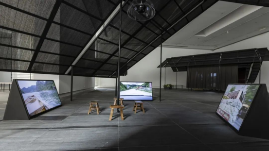 展厅中以亚洲南方常见的“热带坡屋顶”构成影像聚落,并不过多强调艺术家与人类学家作品的分别,这种有意模糊学科边界和对专业中心主义的降解,是希望在去掉知识标签后,以影像作品为核心构建多维感官现场。除了影像作品,本次策展设计还在展厅中部呈现了这次策展过程的讨论中值得分享的观点,并提供给观众加入进来继续讨论的媒介,这种参与式策展方法为对这些话题感兴趣的更多的“我们”创造了临时的团结空间和时间。这些对话,除了将考察创作者的思考、问题意识和视觉叙事在现场所具有的表达上的穿透性,也希望观看者可以循着感受和直觉的引导创造自己的观看线路,借由作品中亚洲南方的图景、故事和经验,思考到底是什么构成了关于“我们”的认知,理解“目光”背后的历史与现实变迁,以及寻找未来之眼的可能。
